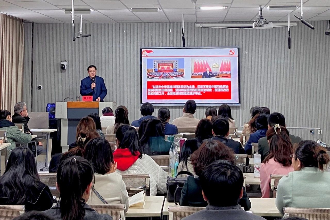 4月12日下午,学校党委常委、纪委书记陈建平在设计学院为全体教师、学生党员代表讲授题为《学习领会党的二十大精神 争做铸牢中华民族共同体意识的践行者》的专题党课。