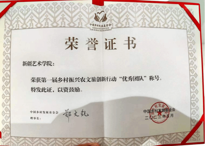 5月17 日,新疆艺术学院设计学院师生代表应邀参加中国乡村发展基金会联合中国国家铁路集团有限公司、清华大学美术学院在京举办乡村振兴农文旅创新行动成果发布暨2023年行动启动仪式。中央和国家机关工委、国家发展和改革委、农业农村部、全国总工会等单位负责同志出席。活动还邀请了参与创新行动的国内10所高校团队、铁路文旅团队、抖音体验设计中心、帮扶县区代表出席。新疆艺术学院设计学院副院长邓岩(援疆)代表新疆艺术学院设计学院领取由中国乡村发展基金会颁发的国家第一届“乡村振兴农文旅创新行动优秀团队”证书。