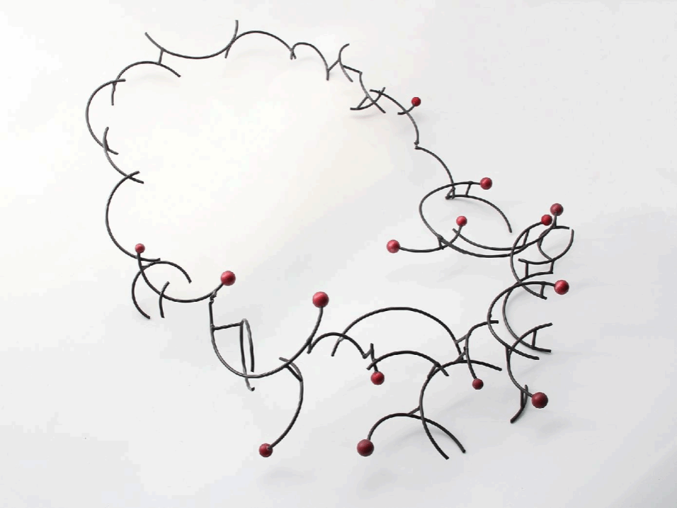 作品采⽤了简单的构成元素,通过空间错落的组合⽅式,形成了⼤量的负空间,这种空间语⾔运⽤看似与西⽅现代主义雕塑有异曲同⼯之妙,实际充满了中国传统美术的留⽩意境。灵感来源于⾎管的交错形态形成的⼀种构成性的肌理美感效果。