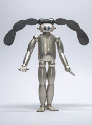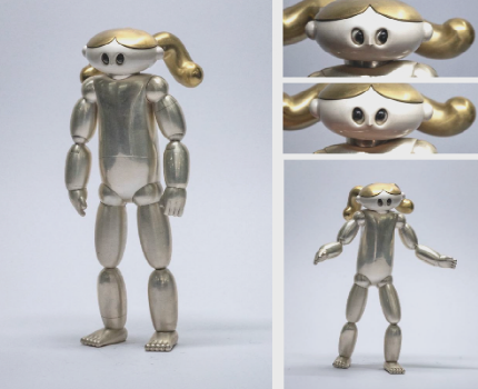 这是⼀组以银材料为主的铸造⼈型雕塑作品,基于失蜡铸造⽅法等传统⼯艺,结合现代数字化造型⼿段及3d打印的成型⽅式。这些银质⼈偶不再仅仅是玩具,创作者将他们视为⼀个闪闪发光的当代⼈类的缩影。作品经由完全原创的数字化⼿段开发了数种精密的活动结构,⼈型主要关节可以实现全⾓度⽆极可动。